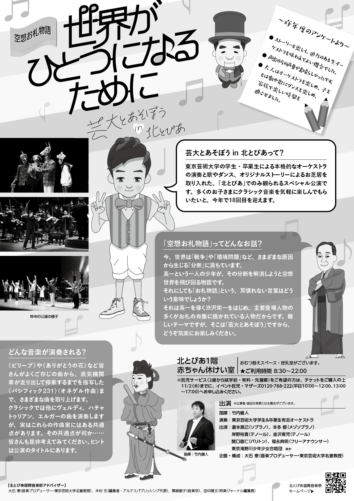 今、世界は「戦争」や「環境問題」など、さまざまな原因から生じる「分断」に満ちています。今回は英一という一人の少年が、その分断を解消しようと空想世界を飛び回る物語です。それにしても”お札物語”という、耳慣れない言葉はどういう意味でしょうか?それは英一を導く渋沢栄一(設定はアンドロイド)をはじめ、主要登場人物の多くがお札の肖像に描かれている人物だからです。難しいテーマですが、そこは「芸大とあそぼう」ですから、どうぞ気楽にお楽しみください。【予定曲】