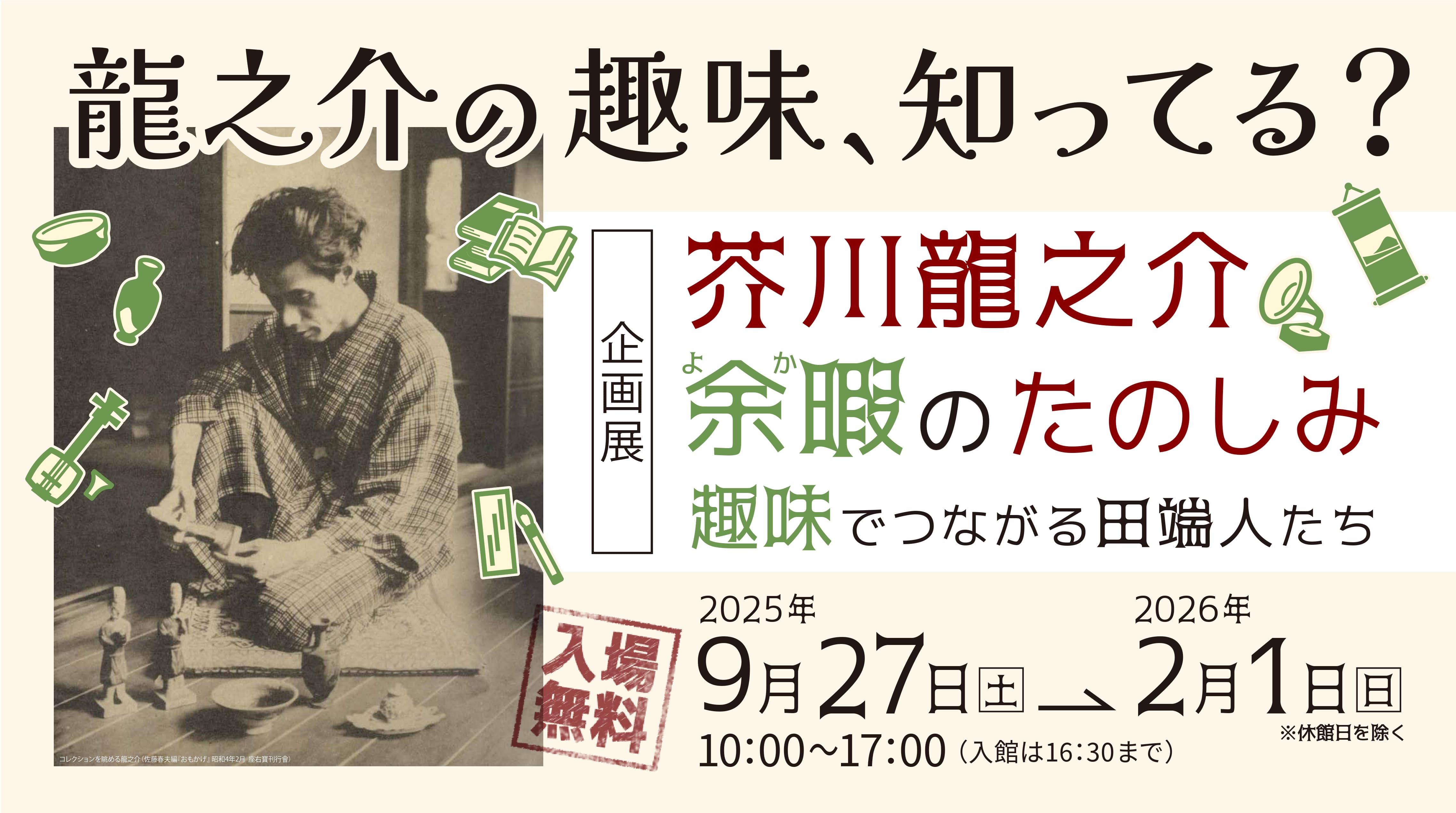 幼い頃から東西の文化に親しみ、豊かな知識や経験を育んだ芥川龍之介。そこで培われた感性は小説に影響を与えただけでなく、日々の暮らしを彩る「趣味」と結びつき、龍之介の心豊かな生活を支えました。絵を眺めたり、芝居を観たり、俳句を作ったり…。本展では、多彩な趣味で余暇を楽しんだ龍之介の素顔と、趣味を通じて交流した田端の文士・芸術家たちをご紹介します。