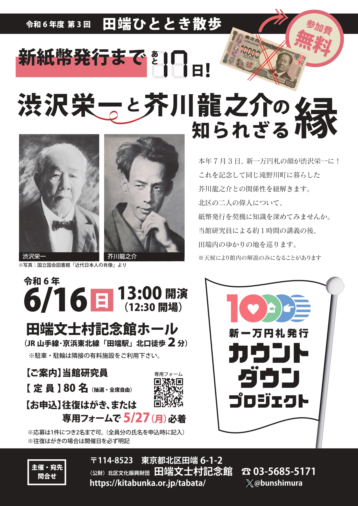 | 概要 | 2024年7月3日、新一万円札の顔が渋沢栄一に!これを記念して同じ滝野川町に暮した芥川龍之介との関係性を紐解きます。北区に暮らした二人の偉人について、新紙幣発行を契機に知識を深めてみませんか。 |