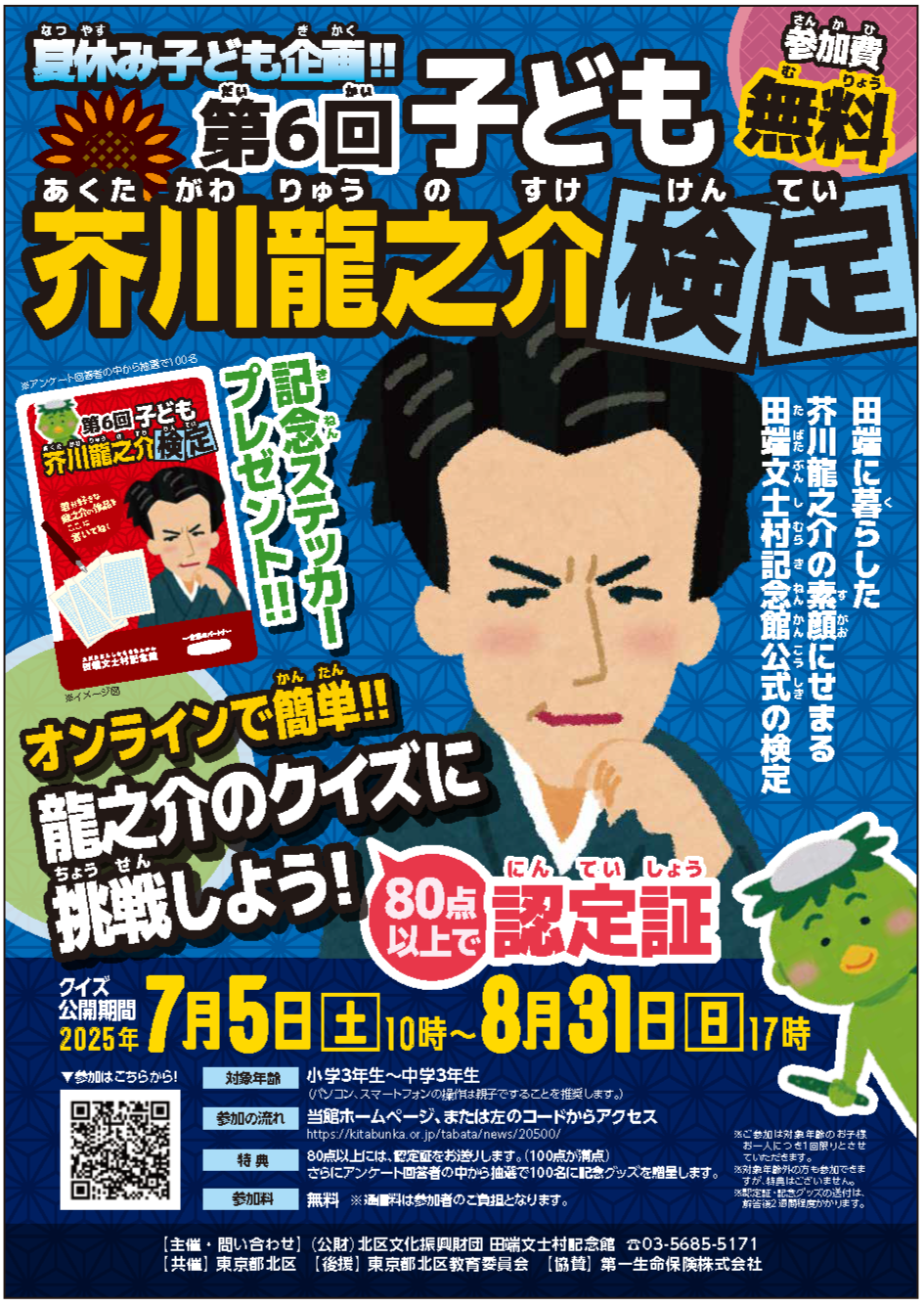 お知らせNews オンライン イベント 夏休み子ども企画! 第6回 子ども芥川龍之介検定 概要 子ども芥川龍之介検定とは、龍之介のクイズをときながら知識をつける、 田端文士村記念館公式の子ども検定です。 ※2025年の検定は終了いたしました。たくさんのご参加ありがとうございました! 期間 2025年7月5日(土)10:00~8月31日(日)~17:00 対象年齢 小学3年生~中学3年生 参加費 無料(通信料はお客様のご負担となります) 参加方法 2025年の検定は終了いたしました。 PDFダウンロード 一覧へもどる