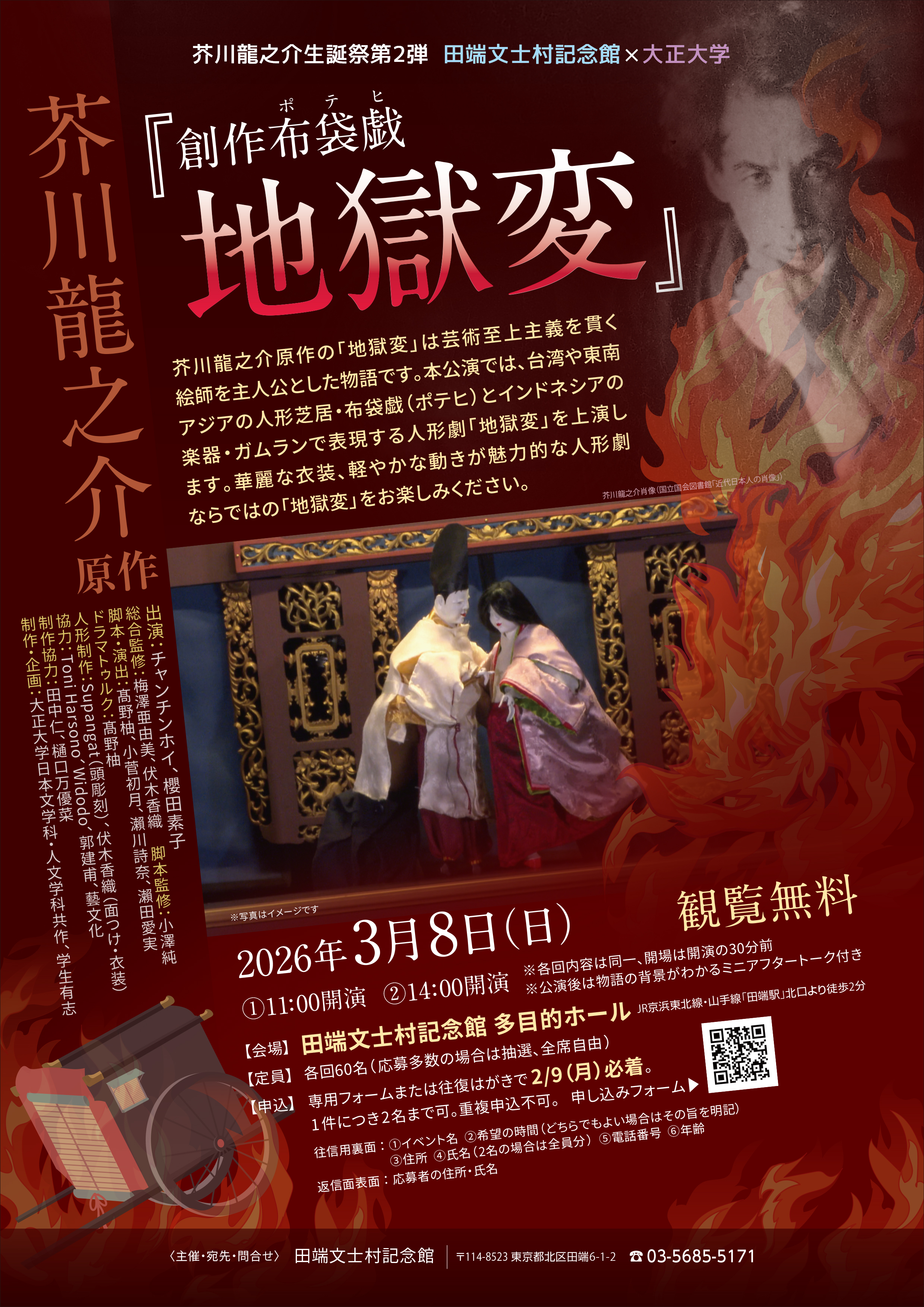 | 概要 | 芥川龍之介原作の「地獄変」は芸術至上主義を貫く絵師を主人公とした物語です。本公演では、台湾や東南アジアの人形芝居・布袋戯(ポテヒ)とインドネシアの楽器・ガムランで表現する人形劇「地獄変」を上演します。華麗な衣装、軽やかな動きが魅力的な人形劇ならではの「地獄変」をお楽しみください。 |