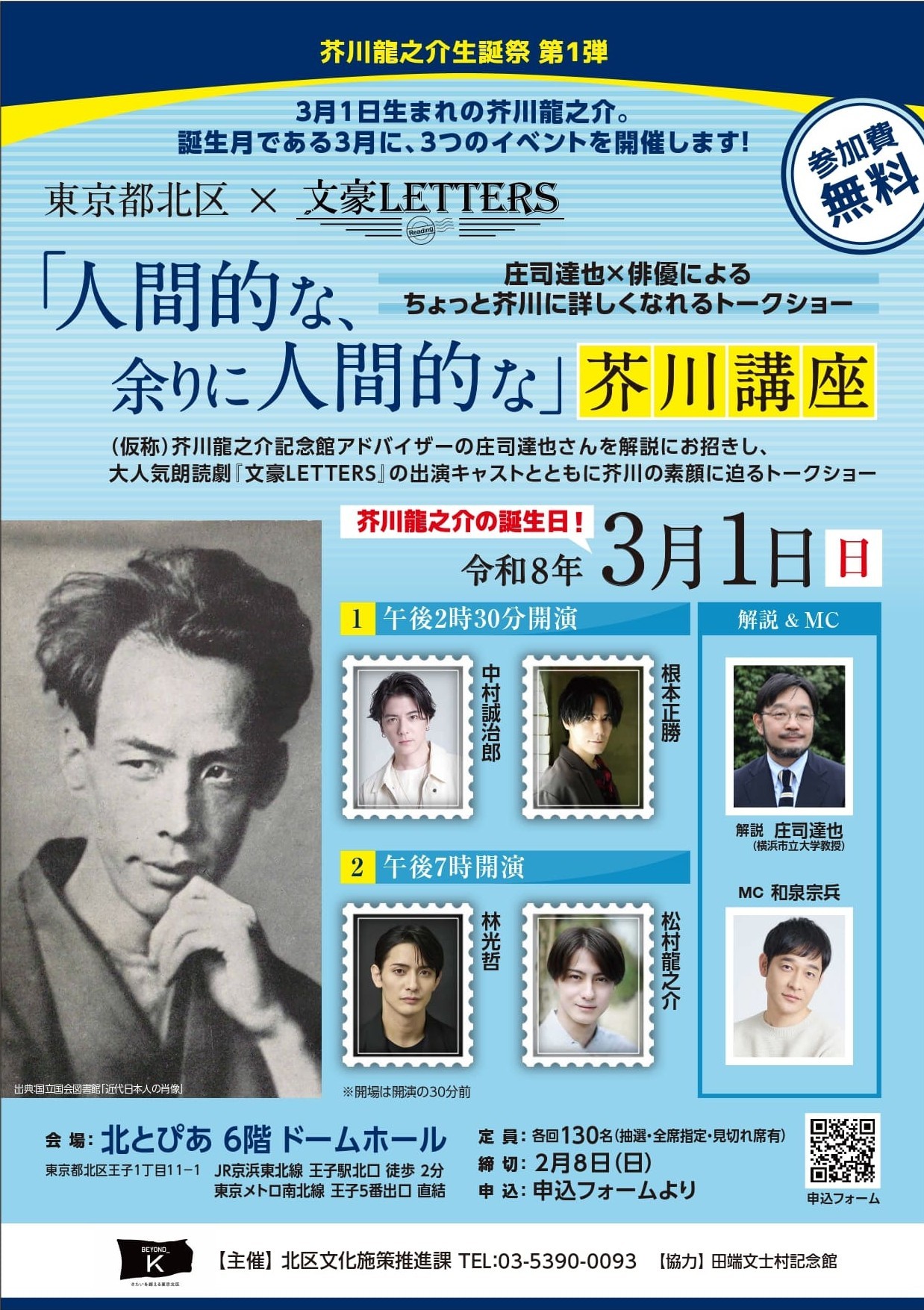 | 概要 | 芥川龍之介の誕生日・3月1日を記念し、「ちょっと芥川に詳しくなれる」トークショーを開催します。(仮称)芥川龍之介記念館アドバイザーの庄司達也さんを解説にお招きし、大人気朗読劇『文豪LETTERS』の出演キャストとともに芥川の素顔に迫ります。 |