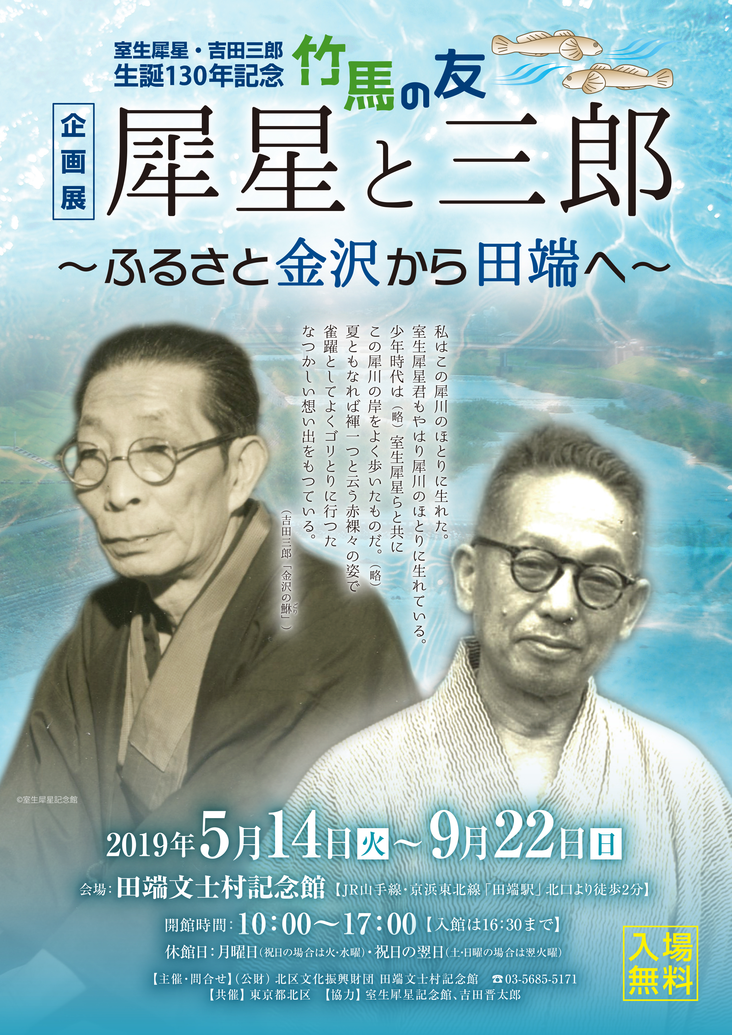 | 概要 | 「ふるさとは遠きにありて思ふもの~」と詠んだ詩人・室生犀星と、上野恩賜公園内にある「野口英世像」を制作した彫刻家・吉田三郎。故郷・金沢の犀川で遊んだ幼馴染みの2人は、道は違えども作家として、彫刻家としてそれぞれ大成しました。犀星と三郎は、生まれ年はもとより、東京・田端で仕事の地盤を築いたこと、日本芸術院会員、没年、斎場までも同じと多くの共通点を持っています。 |