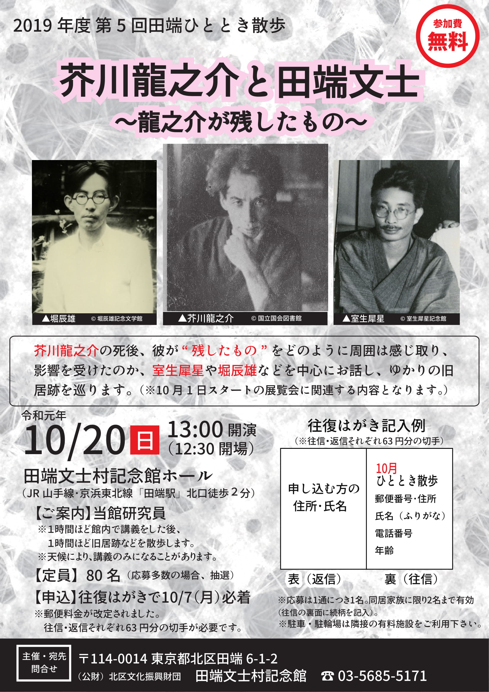 | 概要 | 芥川龍之介が“残したもの”を龍之介没後、どのように周囲は感じ取り、影響を受けたのか、室生犀星と堀辰雄など田端文士を中心にお話します。(※10月開催の展覧会に関連する内容となります) |
