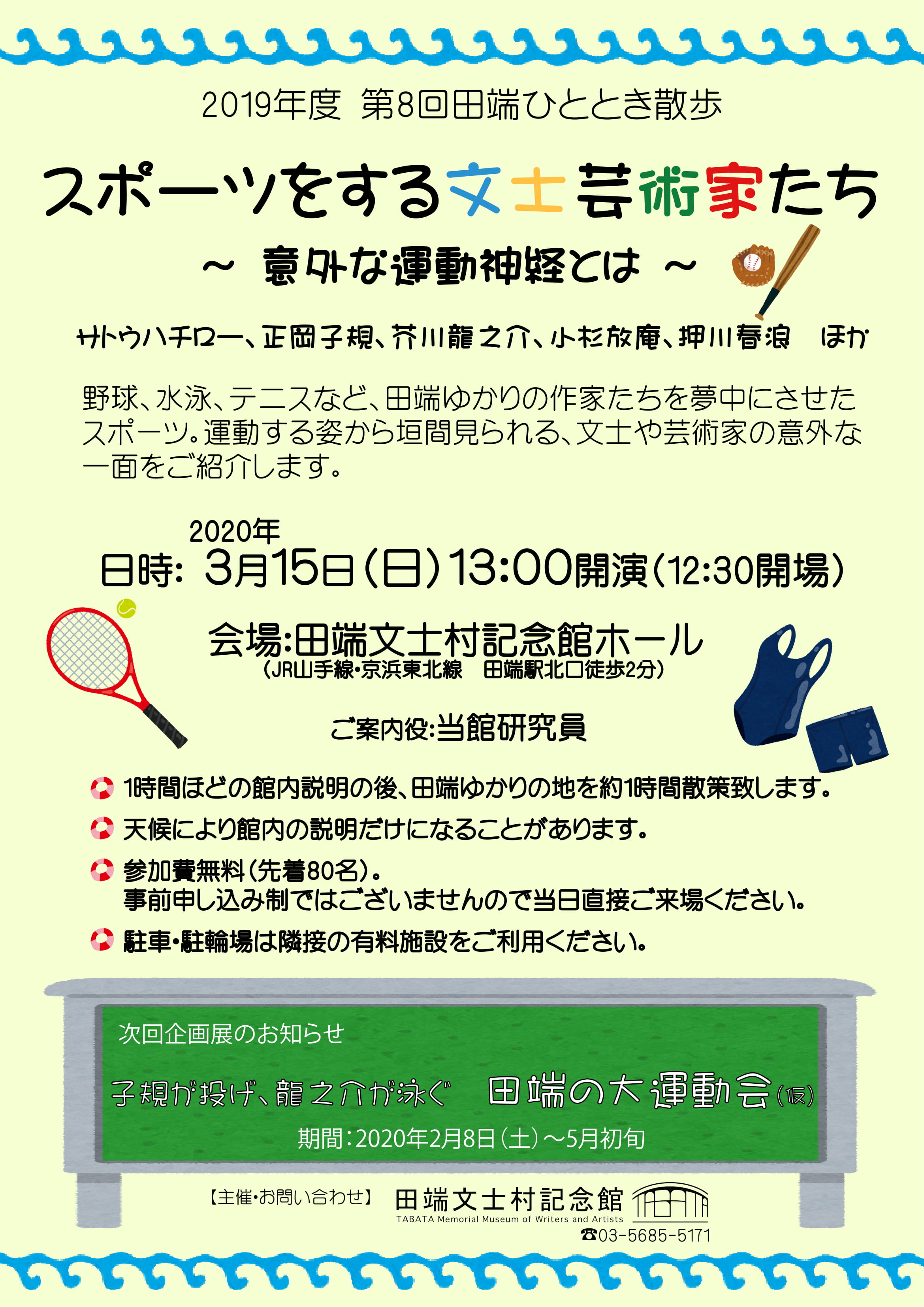 お知らせNews イベント ひととき散歩中止 3月ひととき散歩 スポーツをする文士芸術家たち ~意外な運動神経とは~ 概要 【3月ひととき散歩中止のお知らせ】 新型コロナウイルスの感染拡大を防止するため、3月ひととき散歩につきましては中止することとします。ご理解とご協力をお願いいたします。 一覧へもどる