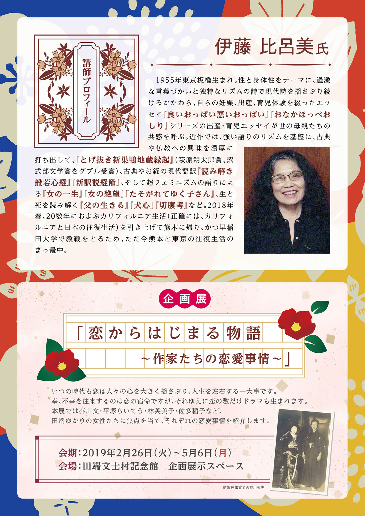 | 概要 | 現代詩から古典やお経の現代語訳まで、常に新しい分野を開拓する詩人・伊藤比呂美。自身の芥川体験をもとに、初めて「芥川龍之介」について語ります。 |