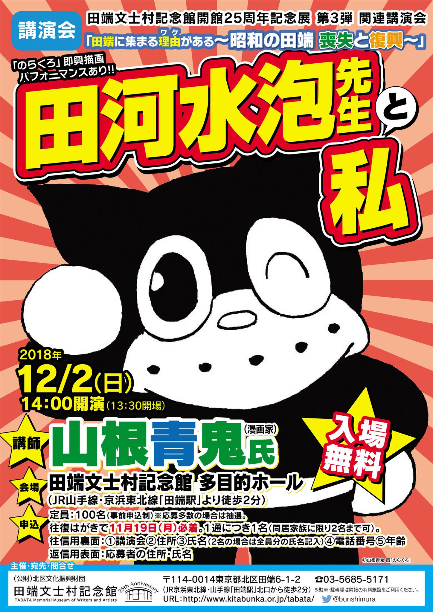 | 概要 | 中学生の頃に田河水泡の門下生となり、後年には「のらくろ」の執筆権を継承した漫画家・山根青鬼氏。田河水泡との交流エピソードや師弟の思い出などについて幅広くお話し、講演終盤には即興で「のらくろ」を描いて頂きます。 |
