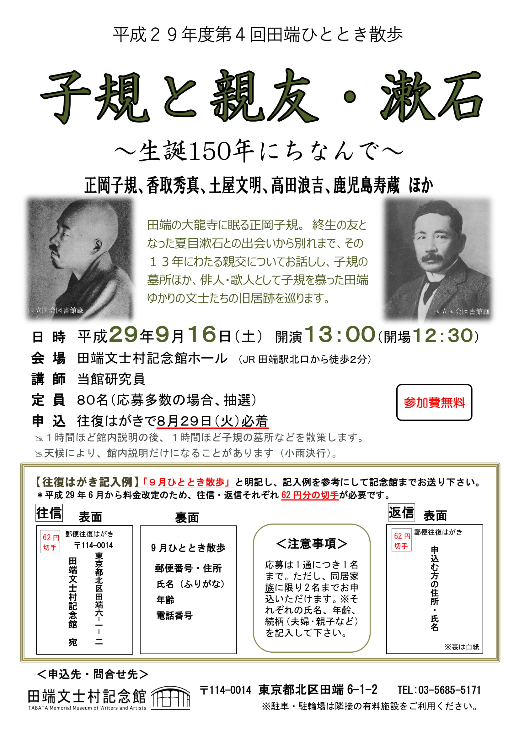 | 申込方法 | 往復はがき(8月29日(火)までに必着) 往信用裏面…①9月ひととき散歩②住所③氏名(2名の場合は全員分)④電話番号⑤年齢 返信用表面…応募者の住所・氏名 ※1通につき1名(同居家族に限り2名まで可)。 |