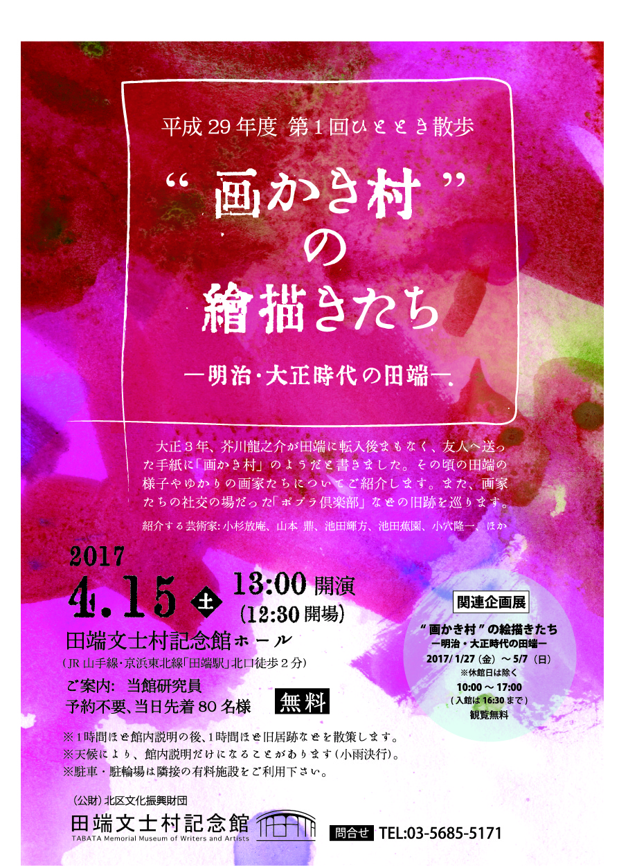 お知らせNews イベント ひととき散歩 4月ひととき散歩 画かき村の繪描きたち~明治、大正時代の田端~ 期間 2017年4月15日(土) 入場料 無料 講師 当館研究員 開演時間 13時開演(12時30分開場) 定員 先着80名 一覧へもどる