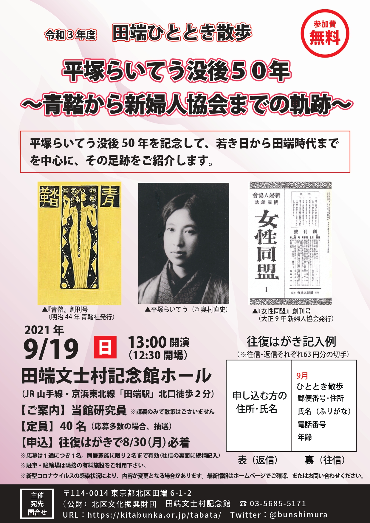 お知らせNews イベント ひととき散歩 お知らせ 9月田端ひととき講座 平塚らいてう没後50年~青鞜から新婦人協会までの軌跡~ 概要 平塚らいてうの没後50年を記念して、青鞜から新婦人協会までを中心に、社会的な活動から家庭的な一面までをご紹介します。 期間 2021年9月19日(日)13:00開演(12:30開場) 入場料 無料 定員 40名(抽選) 申込方法 往復はがき(田端文士村記念館宛に8/30(月)までに必着) 往信用裏面…①講座名②参加希望の開催日③住所④氏名(2名の場合は全員分)⑤電話番号⑥年齢 PDFダウンロード 一覧へもどる