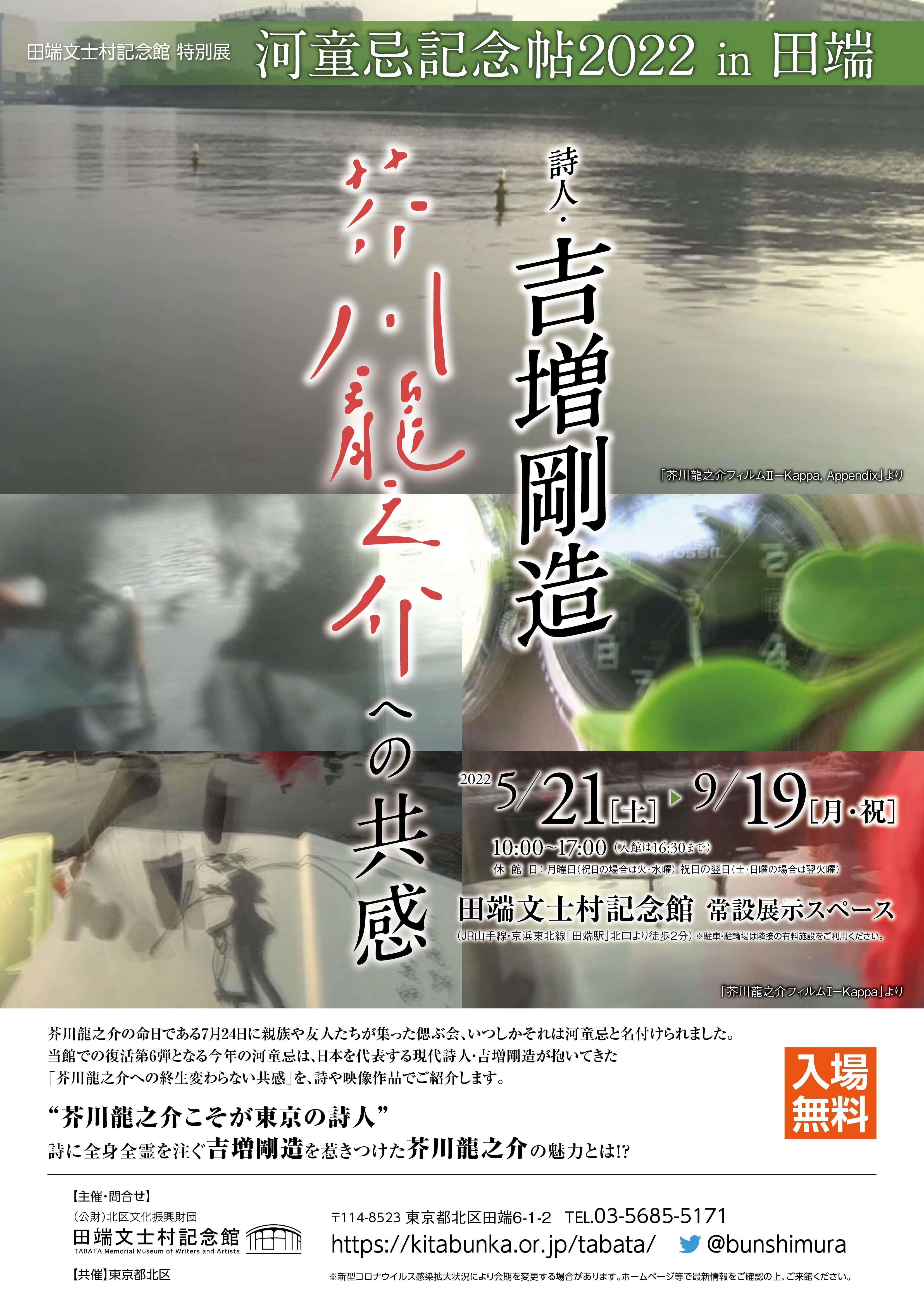 お知らせNews 河童忌 展示 河童忌記念帖2022 in 田端 詩人・吉増剛造 芥川龍之介への共感 概要 芥川龍之介の命日である7月24日に親族や友人たちが集った偲ぶ会、いつしかそれは河童忌と名付けられました。 当館での復活第6弾となる今年の河童忌は、日本を代表する現代詩人・吉増剛造が抱いてきた 「芥川龍之介への終生変わらない共感」を、詩や映像作品でご紹介します。 “芥川龍之介こそが東京の詩人” 詩に全身全霊を注ぐ吉増剛造を惹きつけた芥川龍之介の魅力とは!? 期間 2022年5月21日(土)~9月19日(月・祝) ※休館日を除く 入場料 無料 会場 常設展示スペース PDFダウンロード 一覧へもどる