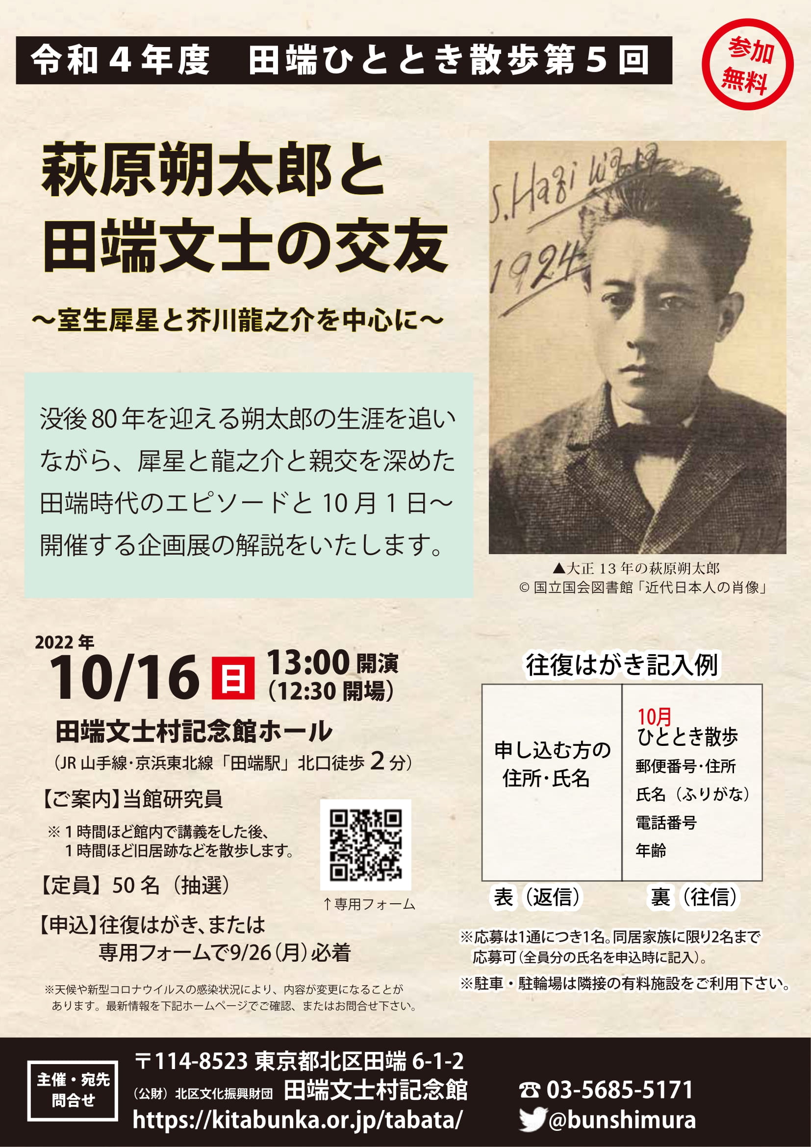 | 概要 | 没後80年を迎える朔太郎の生涯を追いながら、犀星と龍之介と親交を深めた田端時代のエピソードと10月1日~開催する企画展の解説をいたします。 ※天候や新型コロナウイルスの感染状況により、内容が変更になることがあります。 |